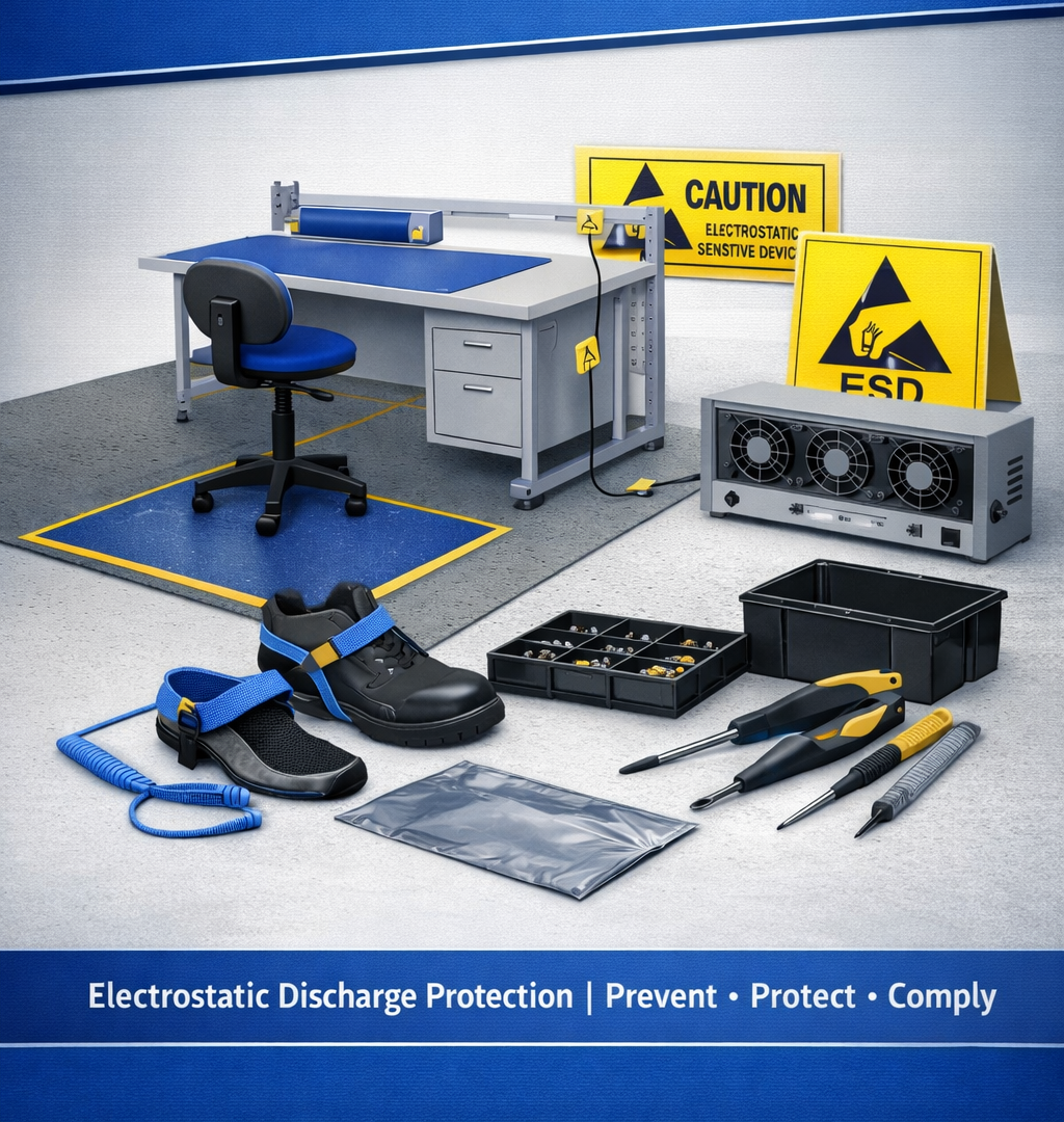 Designed to protect sensitive electronic components from electrostatic discharge, our ESD solutions include workstations, mats, wrist straps, footwear, storage, and grounding accessories. Built to meet industry standards, they ensure safe handling, product reliability, and compliance in electronics manufacturing environments.